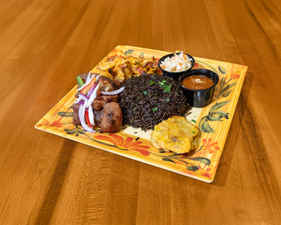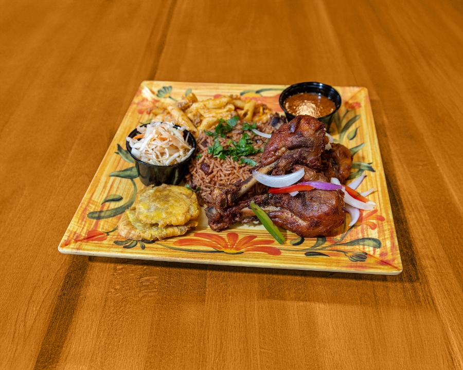 Served with a small side of Haitian mac & cheese, fried plantains, a cup of pikliz, and your choice of rice.